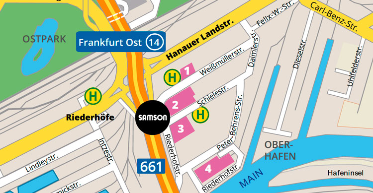 Change from the A5 to the A3 in the direction of Würzburg/ Offenbach at Frankfurter Kreuz when coming from the South. Coming from either the West or East, you will already be driving on the A3. At Offenbacher Kreuz, change to the A661 in the direction of Bad Homburg. Leave A661 at the Frankfurt Ost 14 exit and continue towards Hanau. Turn right at the first junction and follow the SAMSON signs.