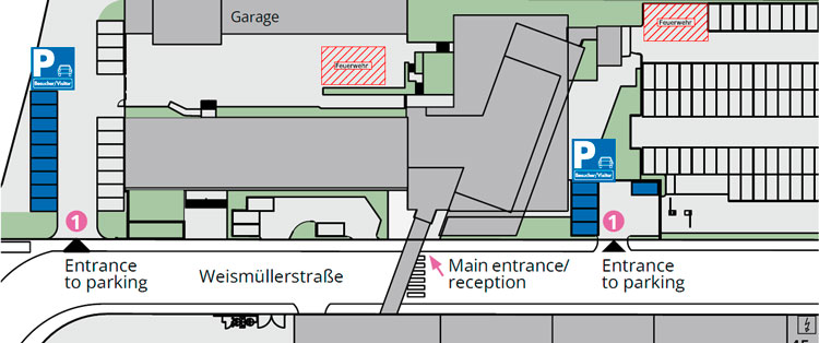 The parking spaces highlighted in blue on the map are reserved for visitors. After parking, please register at the reception (main entrance) or at the entrance on Schielestraße.