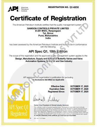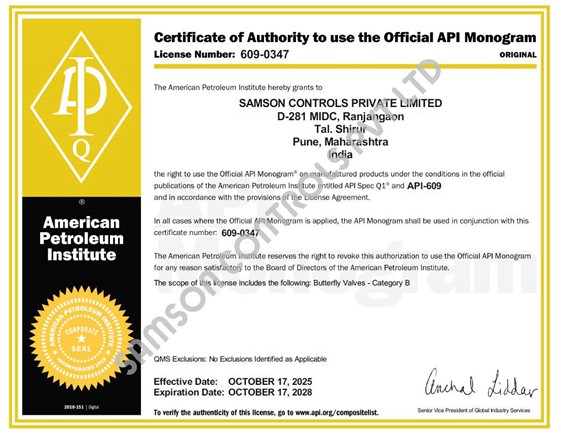 Samson Controls Pvt. Ltd. has been awarded two prestigious certifications from the American Petroleum Institute (API) — a testament to our commitment to quality, compliance, and excellence in the Oil & Gas industry.