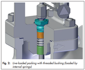 Tiltak for å minimere ekstern lekkasje er delt i to kategorier: statiske og dynamiske tetninger. Ventilpakninger og flensforbindelser tilhører kategorien statisk tetning. Dynamisk tetninger inkluderer pakkboks, belgtetning og membranpakninger. Pakkboksen må tette mot den bevegelige pluggstammen for å sikre at prosessmediet inne i ventilen ikke kan unnslippe til atmosfæresfæren, men uten å svekke ventilens ytelse. Pakkbokser finnes i ulike varianter og inneholder flere ringer, en eller flere foringer og skiver. Kombinasjonen av deler og materialer avhenger av ventilapplikasjonen, trykk, temperatur og mediets motstandsegenskaper. Det finnes forskjellige typer pakningsringer som kan lages av ulike materialer. Typiske pakningsringtyper inkluderer glatte, V-formede og flettede ringer som kan lages av grafitt, PTFE eller modifisert PTFE-materiale. En rustfri stålfjær laget av 1.4310 (standard), (Monel® 400) eller (Hastelloy® C4) brukes for selvstrammende pakkbokser. Figur 2 viser et eksempel på selvstrammende pakkboks bestående av tetningsringer, fjær og pakkboksmutter.