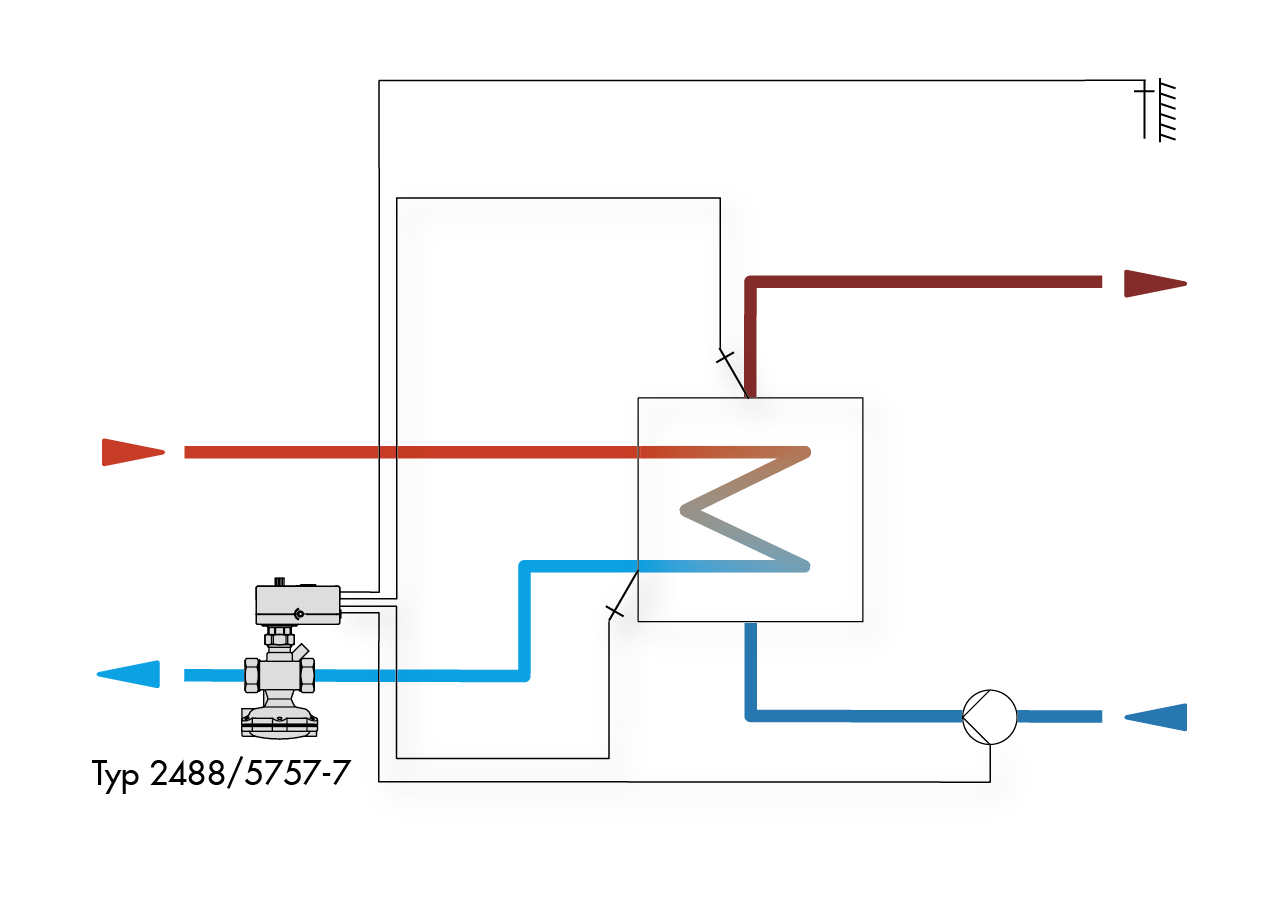 Die Anwendung entspricht der links beschriebenen Anwendung. Anstelle des Fernheizungsreglers und des elektrischen Antriebs wird hier ein elektrischer Prozessregelantrieb, z. B. TROVIS 5757-7, für Heiz- und Kühlanwendungen eingesetzt. In ihm sind die Funktionen „Witterungsgeführte Regelung” und „Rücklauftemperaturbegrenzung” betriebsfertig implementiert. Darüber hinaus kann der Prozessregelantrieb direkt eine Pumpe ein- und ausschalten.
